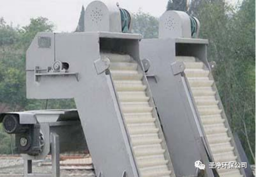 耙齒鏈運(yùn)轉(zhuǎn)到設(shè)備的上部時(shí),由于槽輪和彎軌的導(dǎo)向,使每組耙齒之間產(chǎn)生相對(duì)自清運(yùn)動(dòng),絕大部分固體物質(zhì)靠重力落下。另一部分則依靠清掃器的反向運(yùn)動(dòng)把粘在耙齒上的雜物清掃干凈。
